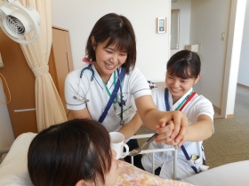 当院には、感染管理、摂食・嚥下障害看護、認知症看護の3分野5名の認定看護師と感染に係る薬剤投与関連、精神及び神経症状に係る薬剤投与関連、栄養及び水分管理に係る薬剤投与関連、創傷管理関連の特定行為研修を修了した看護師4名が活動しています。新人への教育場面では、熟練した看護技術と知識を用いて、根拠に基づいた丁寧な技術指導を行っています。